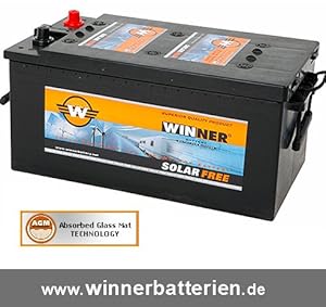 PRODUKTINFORMATION WINNER SOLAR FREE VRLA AGM 210Ah - 12Volt Sicherheit und Kraft pur dank der neuen AGM Glasvlies Technologie Die WINNER SOLARFREE AGM Batterien kommen komplett ohne flüssige Säure aus. Die Säure ist in einem Glasvlies gebunden, so dass die Batterie in praktisch jeder Lage eingebaut werden kann. Das verschlossene System ist mit einem Überdruckventil, dem VRLA ausgestattet. AGM-Batterien haben ein sehr gutes Preis-/Leistungsverhältnis und sind gerade bei hohen zyklischen Belastungen die beste Wahl. Produktmerkmale: - Innovative AGM Technologie mit Vlies Seperator - Hochwertiges Markenprodukt - Starter- und Bordnetzbatterie - Säureauslaufgeschützt und zyklenfest - Spezieller rüttelfester Aufbau - Kipp- und auslaufsicher sowie rüttelfest bis zu 360° - In jeder Lager und im Innenraum verbaubar - Dickere Platten für tiefere Entladungen - Sehr gutes Dauerstromverhalten - Sehr schnelle Aufladeeigenschaft - Lange Lebensdauer auch bei häufigen Lade-/Entladezykle - Nach DIN EN 60254-1 Norm - VRLA-Sicherheitsventile gegen Überdruck - Besonders niedrige Selbstentladungsrate - Schutz gegen Kriechströme und Selbstentladung. - Schutz gegen Feuer und Funkenbildung - Integrierter Rückzündschutz. - Sicherheit gegen Kurzschluss. - Niedriger Innenwiderstand, hoher (Ent-)Ladestrom - Leistungsfähig auch bei hohem Energiebedarf. - Absolut Wartungsfrei. - Hohe Betriebssicherheit. - Benutzerfreundliche Traggriffe. - Universeller Einbau und optimale Wirtschaftlichkeit.
